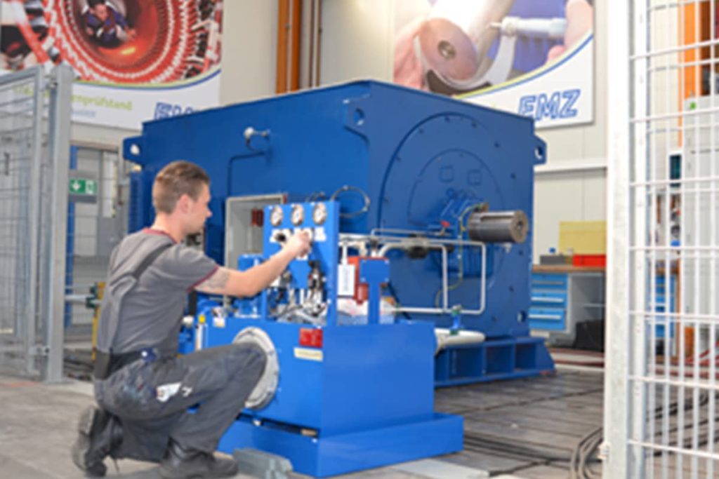 With the support of regional partners, the hydrostatic plain bearings for the oil plant were implemented in a timely manner. Subsequently, the plain bearing machine including the oil system was successfully tested in the internal EMZ test field.
