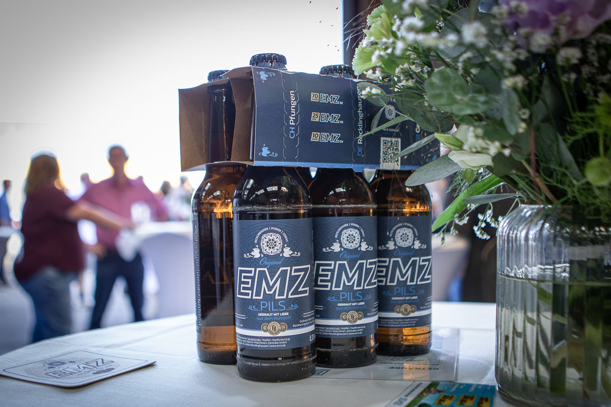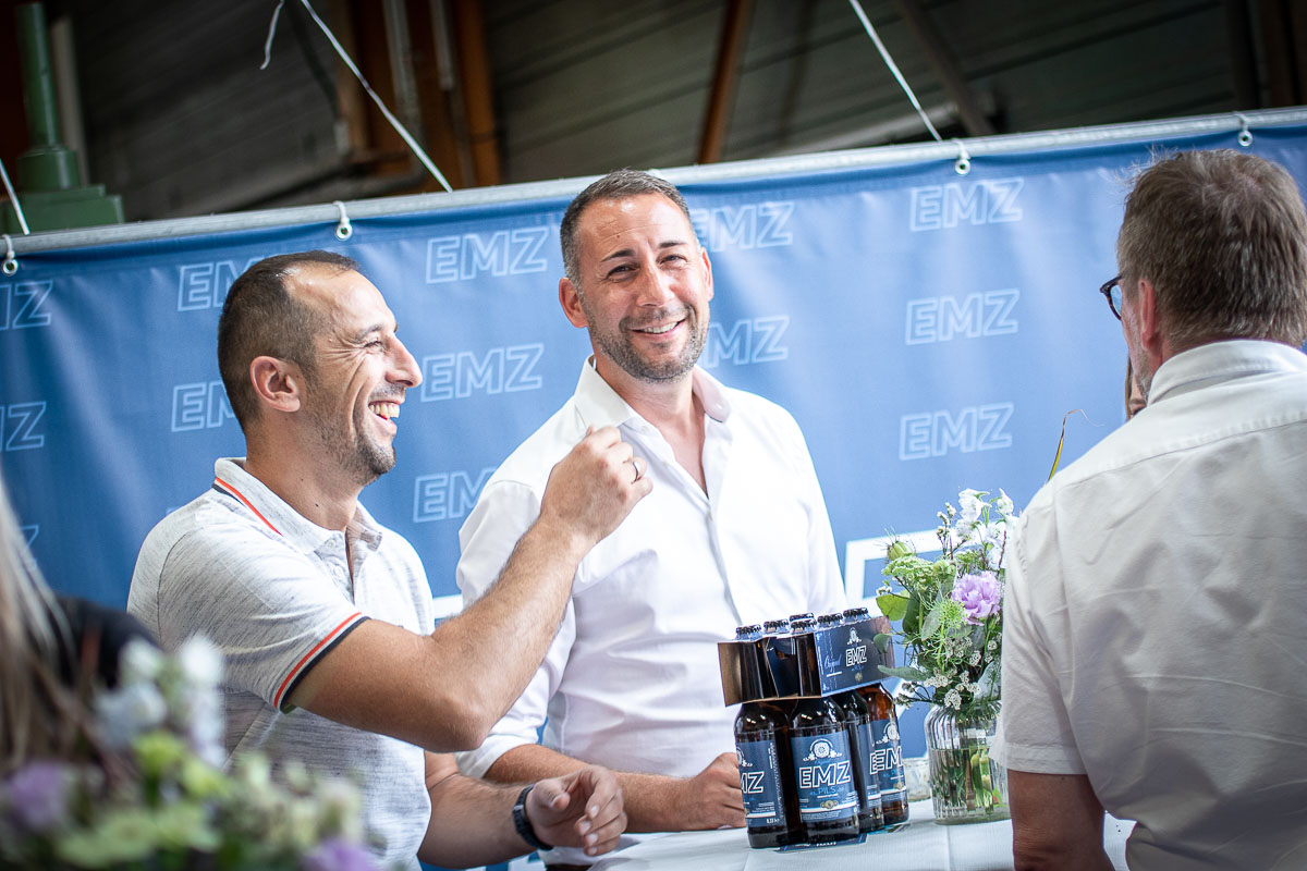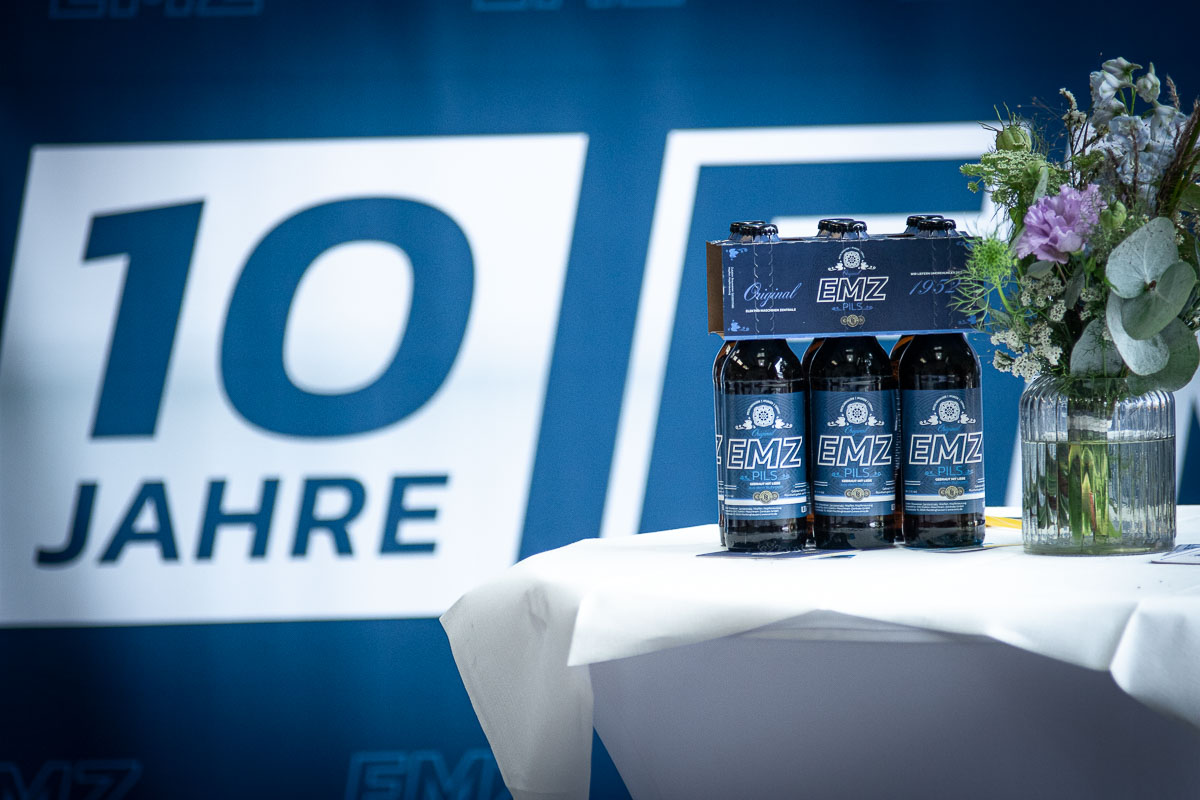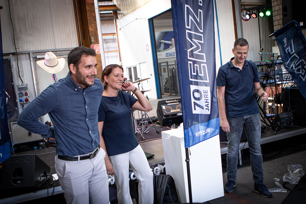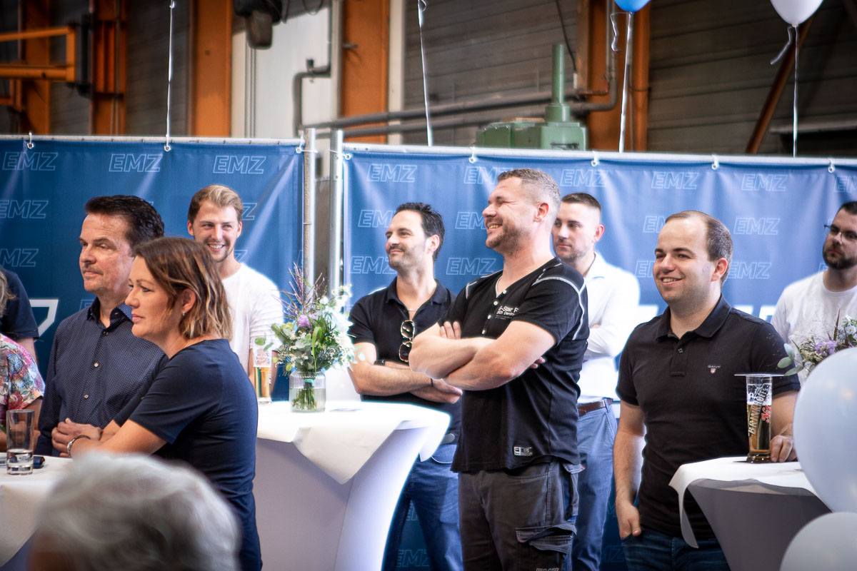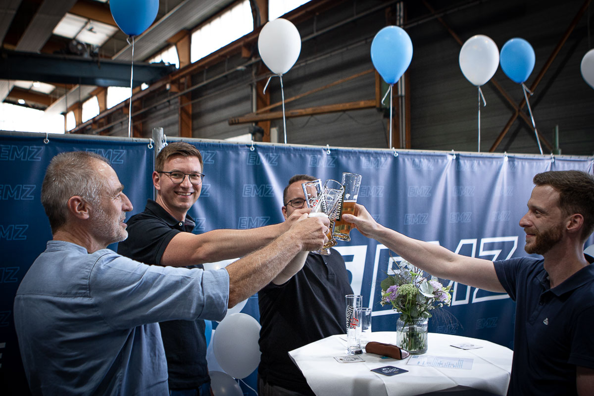 Offizieller Auftakt der Jubiläumsfeierlichkeit war Freitag, der 19. August 2022 am späten Nachmittag bei strahlend blauem Himmel und jeder Menge Sonnenschein auf dem Firmengelände der EMZ GmbH in Recklinghausen. Zahlreiche Gäste (darunter sowohl aktive als auch ehemalige Mitarbeiter), die der Einladung gefolgt waren, wurden von der Geschäftsführerin Deniz Beese und Geschäftsführer Dipl.-Ing. Benedikt Mathiaszyk mit kalten Getränken und einer Eröffnungsrede feierlich begrüßt. Nach der offiziellen Vorstellung des neuen Corporate Designs begann der ausgelassene festliche Teil, für dessen musikalische Untermalung die hiesige Country-Band „Desert Style“ sorgte. Währenddessen konnten Mitarbeiter und Ehemalige das eigens für das Firmenjubiläum gebraute und frisch durch die Geschäftsführung gezapfte EMZ-Bier verköstigen, erfrischende Cocktails und ein vielfältiges Outdoor-Buffet genießen.