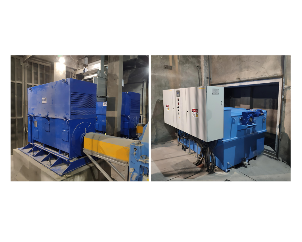 Seit 2023 ist in einem österreichischen Zementwerk ein leistungsstarker EMZ Tandemantrieb im Einsatz. Die EMZ Motoren, mit einer Nennleistung von jeweils 1250 kW, ersetzen zwei 50 Jahre alte Mühlenantriebe, die zunehmend Standzeiten verursacht haben. Die neuen Motoren wurden mit Grundrahmen aus der EMZ Metallbauwerkstatt an das vorhandene Fundament adaptiert, sodass die neuen Motoren vollständig austauschbar sind und keine Umbauarbeiten durchgeführt werden mussten. Der Hochlauf der beiden Schleifringläufermotoren erfolgt durch einen neuen effizienten EMZ Doppelanlasser. Die Montage und Inbetriebnahme erfolgte durch eine enge Kooperation zwischen Betriebstechnikern und dem EMZ Serviceteam, sodass die Hauptmühle nach wenigen Tagen wieder im Einsatz war und die Betriebssicherheit langfristig gewährleistet ist.