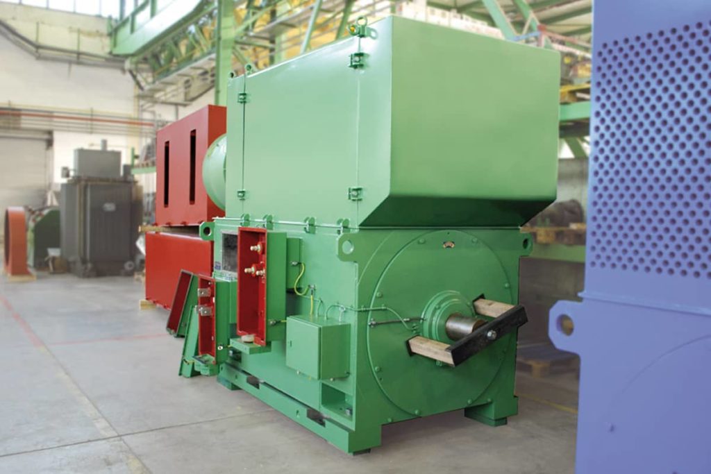 Dieser Nachbau eines 1.200-kW-Motors dient als Hauptantrieb für einen Walzenantrieb in einem Drahtwalzwerk. Der Motor ist mechanisch an die vorhandenen Fundamente der Arbeitsmaschine angepasst und speziell für die Lastspitzen beim Walzwerksbetrieb dimensioniert.